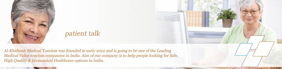 | Mr. and Mrs. Mahmood Al-Mahrouqi, Salalah, (OMAN)We want to express our appreciation for your (Al-khidmah Medical Tourism Pvt. Ltd.) wonderful hospitality and even more wonderful staff. I was welcomed by Mr. Zakiullah and his team on MARCH 20, 2013 and everyone we met during my stay was considerate, professional while still being friendly and caring. We don't have a lot of experience with hospitals, but we know quality when we experience it. Your facility, whiled being a little challenging to find your way around was spotlessly clean and designed to make your patients comfortable and the family and friends feel welcome and comfortable as well. We cannot thank you enough for providing such a comforting, but top-notch environment for what was for us, a very scary procedure. Everyone, and I mean everyone, we were in contact with were wonderful, but we particularly want to mention Mr. Zakiullah who made us feel even extra special and cared for. Thank you for providing such a fine group of care-givers and facility. |